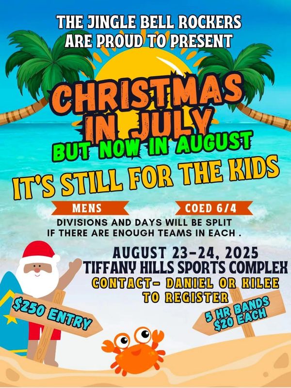 The Jingle Bell Rockers are back at it – because let’s be real, Santa doesn’t just hibernate after December! Join us August 23–24 at Tiffany Hills Sports Complex for a weekend of softball, sunshine, and silly holiday spirit.